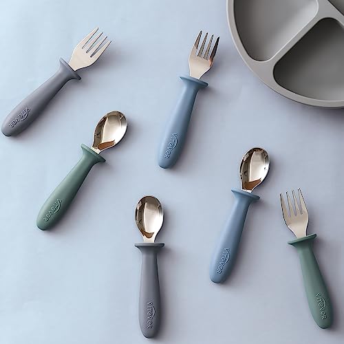 - ENCOURAGE INDEPENDENT EATING: Available in 3 soft colors of 6 pieces, each color includes a spoon & fork set to help your little ones learn self-eating. With three fun colors to choose from, your child will love digging into their favorite foods. Perfect choice for parents who want a safe and practical solution for their little one's mealtime needs.