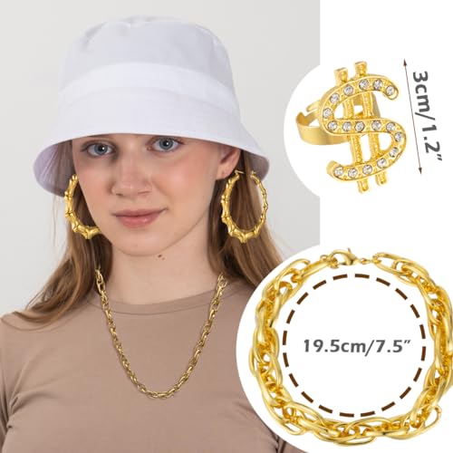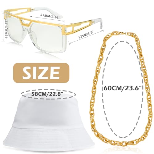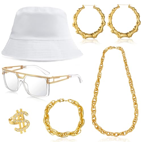 - šćHIP HOP COSTUMEć: This hip hop costume kit includes 1 piece glasses, 1 piece fake gold bracelet, 1 pcs gold plated chain necklace, 1 pair of big hoop earrings, 1 pcs white bucket cap, 1 pcs dollar ring, funny rapper costume set for your 80s/ 90s dress up, so that you can stand out in the crowd and release the brilliance.