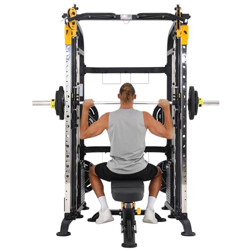 Altas Strength M810 Smith Machine with Pulley System Cage Machine Workout with Linear Bearings Weight Stack: 2 x 220 lbs, Cable Resistance Ratio: 2:1, Pulley System with Stack Weight And Additional Option Plate Weights A Smith Machine is good for prepping your body for heavy weight training or giving extra assistance when you have a weaker side or muscle. You can implement it into squats, deadlifts, hip thrusts, bench presses, and bicep curls. Smith machines make Home Gym easier, especially if you are a woman or new to the gym. The smith machine with a barbell supported on each side and a pulley system moving the weights. Because the bar is moving on a track, it can only move up and down. Safety bars restrict the bar from moving further than you would like, and springs absorb some impacts when dropped, keeping you from getting injured. You can use a smith machine for the following reasons: To get familiar with a specific exercise and its form thereof before trying it with free weightsTo isolate a particular group of muscles for strength purposes or because of muscle imbalancesTo prepare you for an exercise that you are unable to do Smith Machine - Familiarize Yourself With An Exercise On The Smith Machine To get rid of the jitters you might have about trying a free weight movement. Squat, deadlifts, or hip thrusts can be very intimidating, especially if you have never done it before.To identify the movement pattern and the placement of your feet and get the feel of the bar without having to manage a standard barbell of 45 pounds on your shoulders or in your hands. Benefit of Altas Strength M810 with a pulley ratio of 2:1 Reduced resistance: The 2:1 pulley ratio effectively half the resistance of the weight plates. This means that if you load 100 pounds onto the machine, it will feel like you are lifting 50 pounds. This can help you build strength and muscle mass more efficiently.