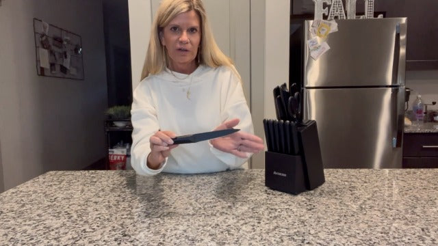 - All in One Knife Set - 15 pieces knife set includes: 8" Chef knife, 8" Slicing knife, 7" Santoku knife, 8" Serrated bread knife, 5" Utility knife, 3.5" Paring knife, 6 Pcs 4.5" serrated steak knife, 1 Pc kitchen shear, and Black hard wood Knife Block with built-in Knife Sharpener.