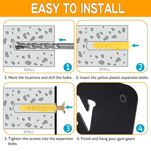 - Space-saving The metal 8 prongs improved version allows you to store extra accessories by taking care of almost every kind of hangable gym gear without worrying about a messy one. Their sturdy frame mounts directly to a wall for increased safety and stability throughout the workout. Protect floors from damage and keeping your workout area organized and safe by easily storing standard plates off the ground.